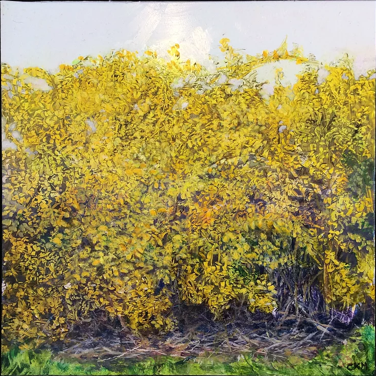 I had fun doing this small work during the blooming of forsythia in New England. I particularly love that flowing plant as it cheers us all up after a long winter!